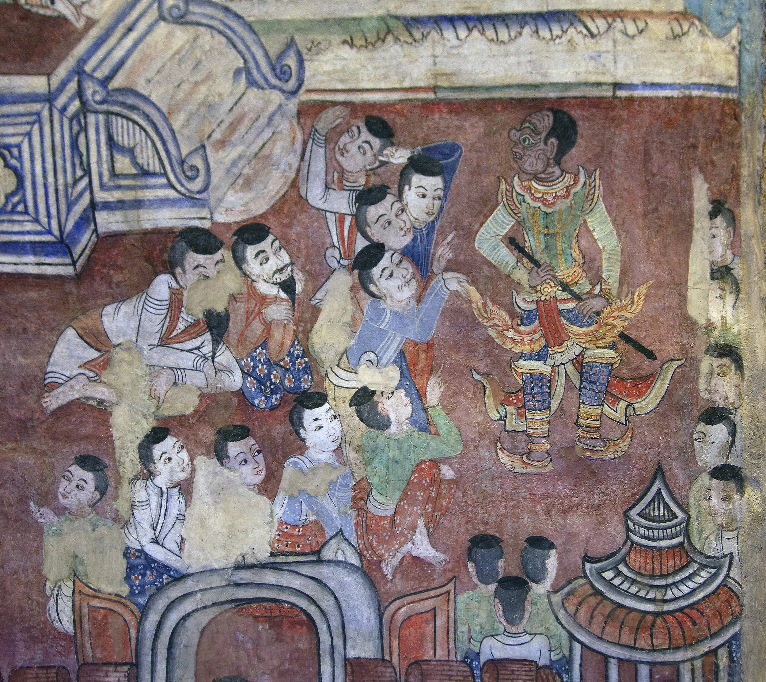 Some of the supreme pleasures of the Sang Thong mural are the opportunities taken by the mural artist to portray regional people in their native clothing. Here are Shan and Burmese officials detailed down to their leg tattoos reaching down just below their knees.