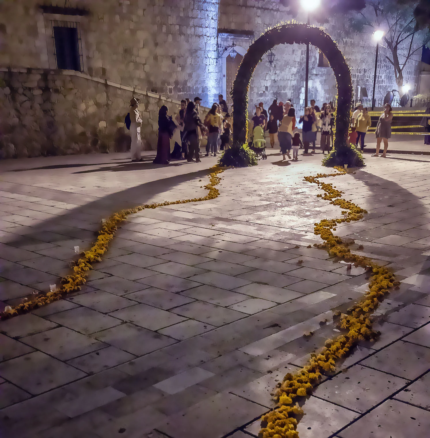 Many villages build ceremonial arches covered in marigolds with pathways marked with flowers to guide and welcome deceased relatives back home during Dia de Muertos.