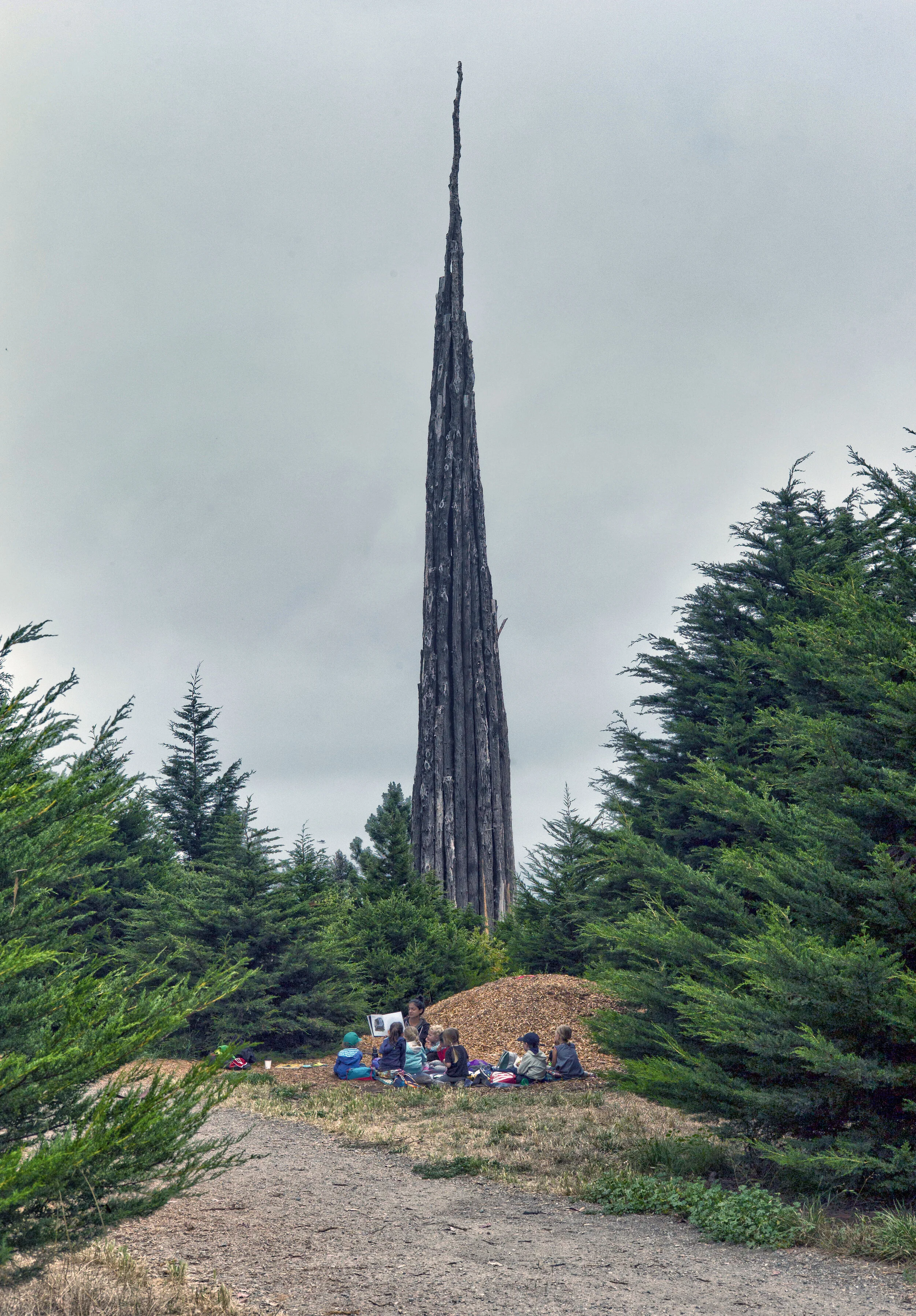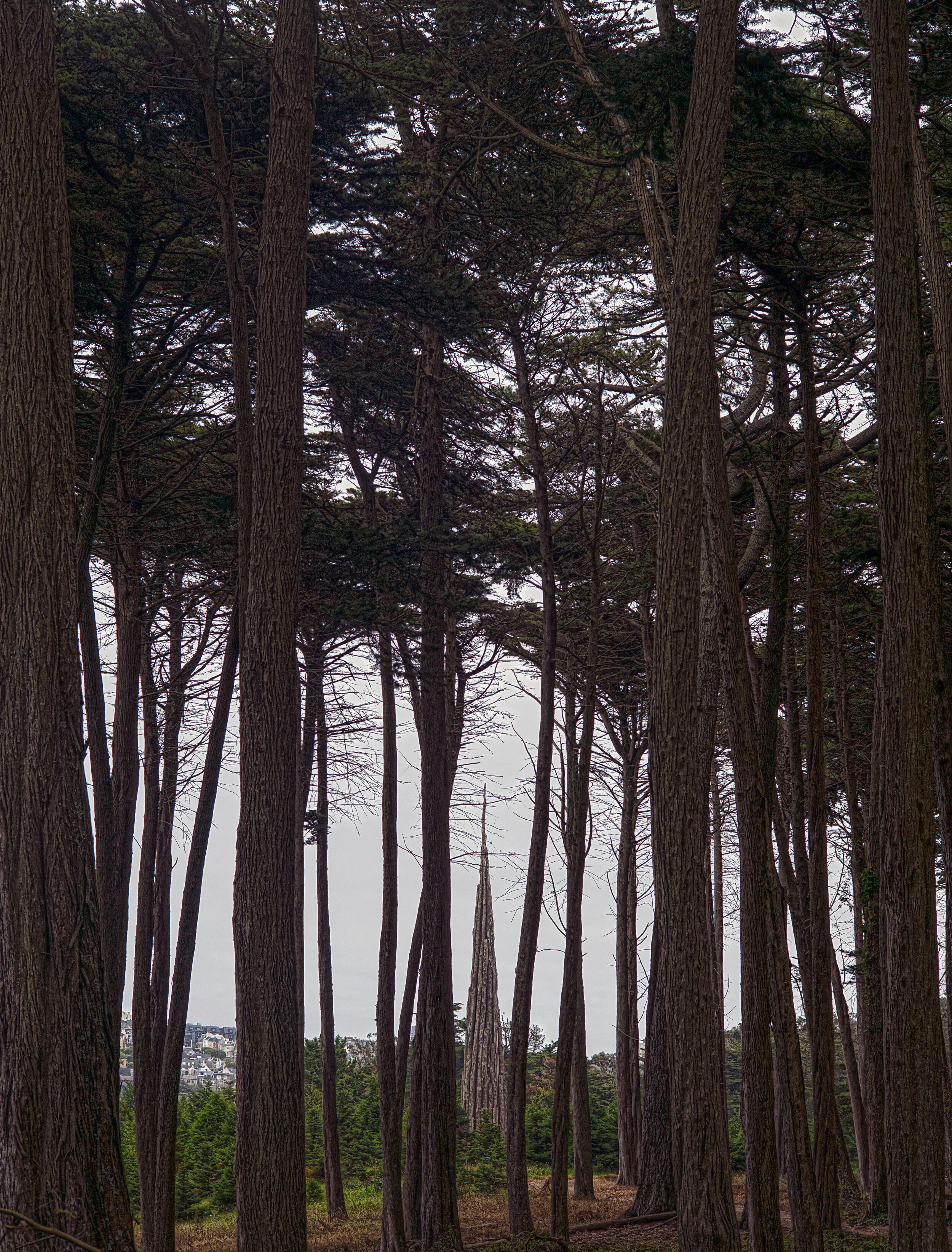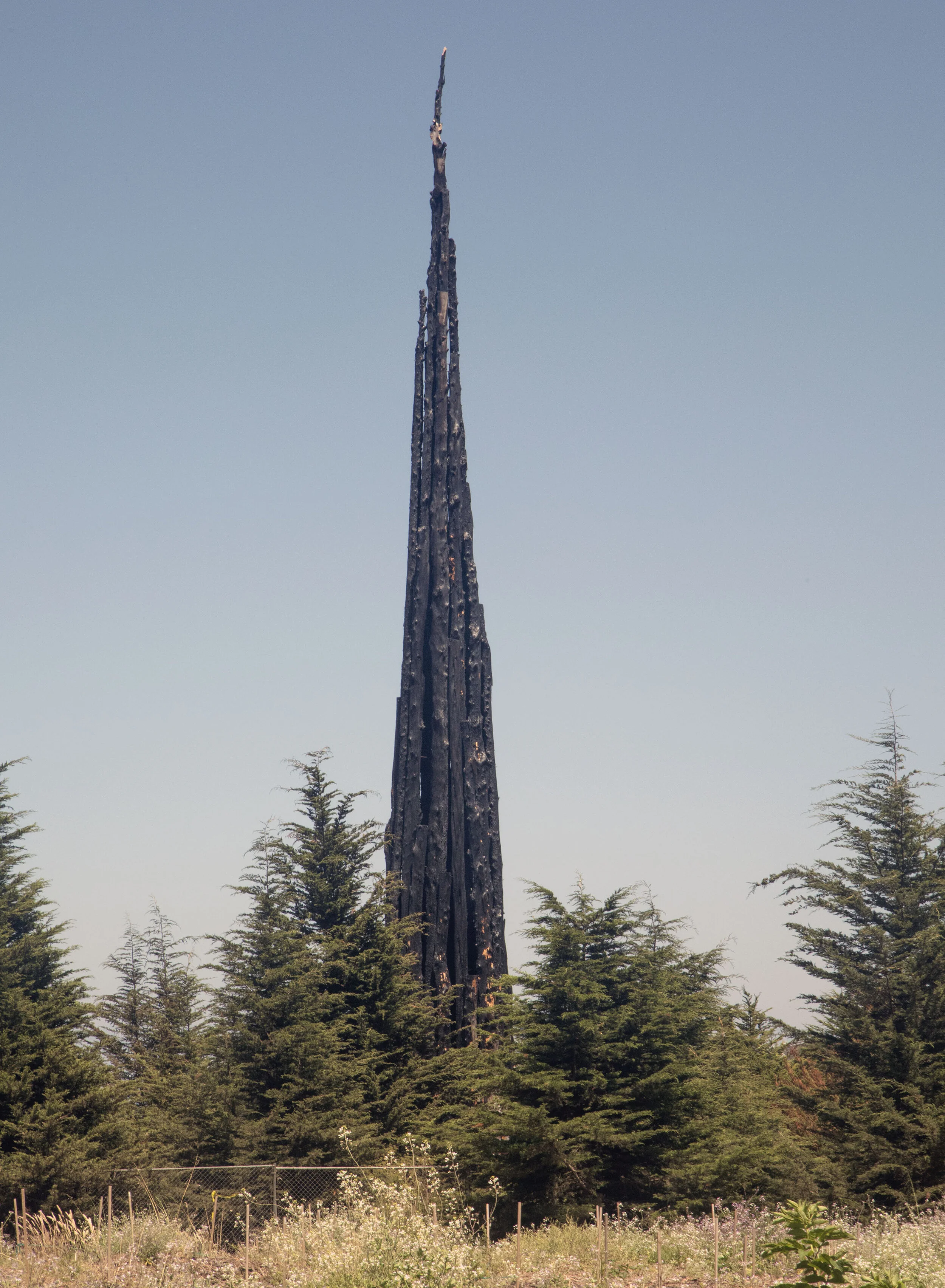 Some years ago I photographed Andy Goldsworthy’s sculpture Spire. The 100-foot-tall sculpture was created in 2008 out of felled cypress trees in the Presidio. The image gives the impression of Spire sheltered and protected by a grove of tall trees. Spire was recently bady charred and damaged by an act of arson and its future is uncertain.